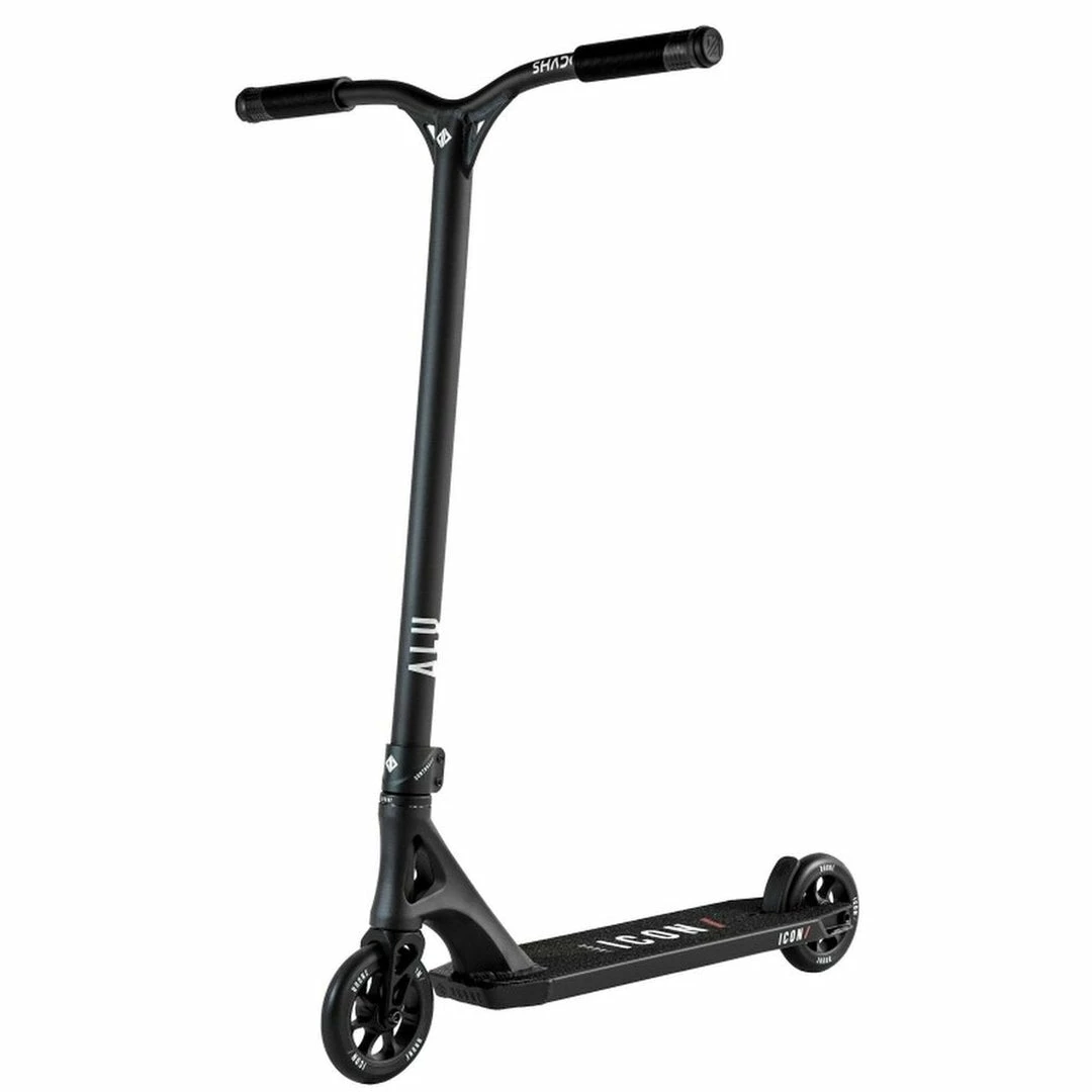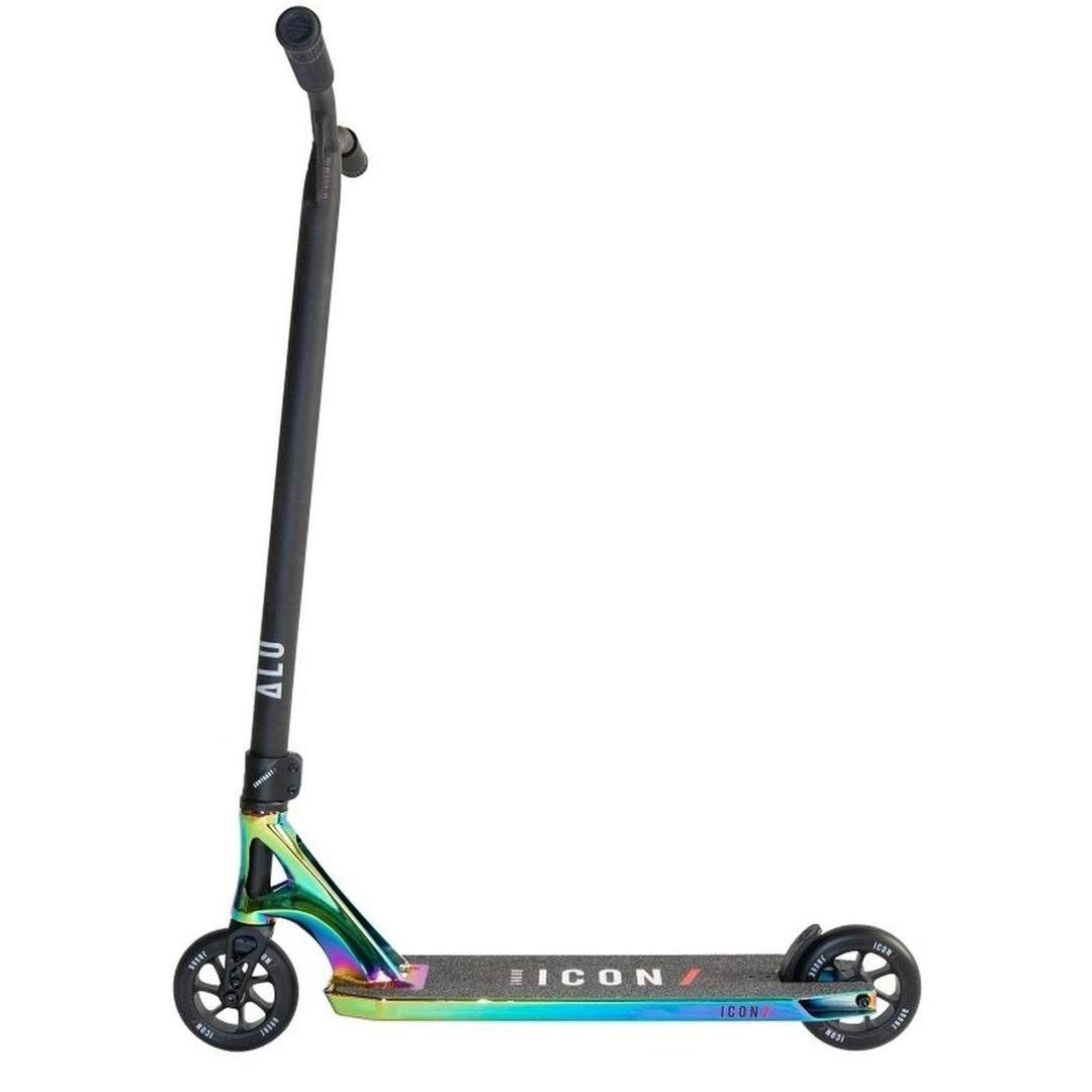 The Drone Icon 1 Scooter is built around a 4.9″ by 19.5″ deck with an 82.5 degree headtube angle. Because the deck does not have boxed ends, we consider the Drone Icon Scooter deck to be a park deck but it’s equally at home at the skatepark or in your hood. PRO SCOOTER DECKS that are 19-19.99″ long will be ideal for intermediate to pro riders that have been in the sport for a while or for those scooter riders that need a little more footspace. The Drone Icon 1 Complete features oversized outer diameter Y-Bars that are 24.8″ tall by 22″ wide. Bars this size are ideal for riders who are 5 to 5.5 feet tall. Bars and forks are tied together via an IHC compression system, which is a favorite among pro scooter riders. Finally, the Drone Icon rolls on 110mm x 24mm wheels, which are the most popular size among riders.If you are looking for a capable park scooter, the Drone Icon 1 Complete Scooter might just be the scooter for you!