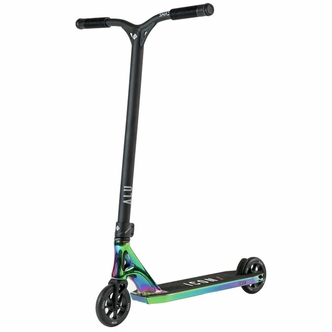 The Icon 1 is Drone’s flagship park pro scooter and it’s serious. It weighs in at just 7.04 pounds. 9 lbs is standard, 8 pounds is light, 7 pounds is exceptional! We all know that 19.5 inches is the ultimate park deck size, keeping things light and nimble but the Icon deck is 4.9 inches wide, which makes it suitable for a wide variety of park riders. To keep in line with the light park slayer theme, Drone suited the Icon 1 up with extremely lightweight Shadow 2 aluminum bars. Topping it off are the usual park assault components like 110mm Icon spoked wheels, a Drone synergy headset, Contrast aluminum double clamp, and Majesty IHC forks. While it sports conventional 110x24mm wheels, it is compatible with 30mm wide wheels (fork and deck spacers much be purchased separately). We think the Icon 1 is arguably the best looking scooter available on the market today – sinister in black and edgy in neochrome. Not matter which color way you purchase, the Icon 1 pro scooter looks almost as good as it performs at the park!