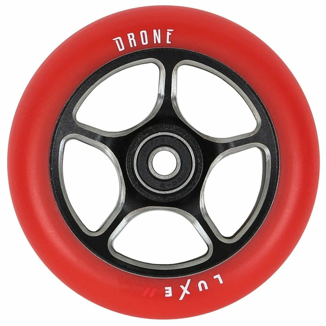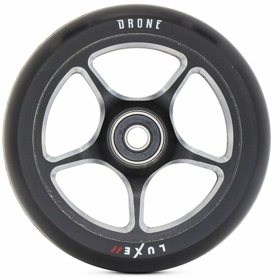 Drone Luxe Wheels are 88A PU, which means that Drone intended them to be ridden on the street because they are harder and more durable than 86A wheels. Drone Scooter Wheels are 24mm wide at the core and should be used with 24mm wheels spacers. The PU width is 24mm. Most PRO SCOOTER FORKS and decks were designed to handle a 24mm wheel core. Since both the core and PU of the Drone Scooter Wheels are 24mm, every fork and deck we sell should be compatible with these wheels. Drone Luxe Wheels have a 110mm outer diameter, making them perfect for the advanced beginner to intermediate riders. 110mm wheels have long been the standard diameter for most intermediate pro scooters. However, as scooter wheels become wider and taller due to pro riders need for big trick speed, 110mm wheels are becoming the norm for beginner to intermediate scooter riders. Drone Luxe Wheels 110mm come standard with pre-installed bearings.