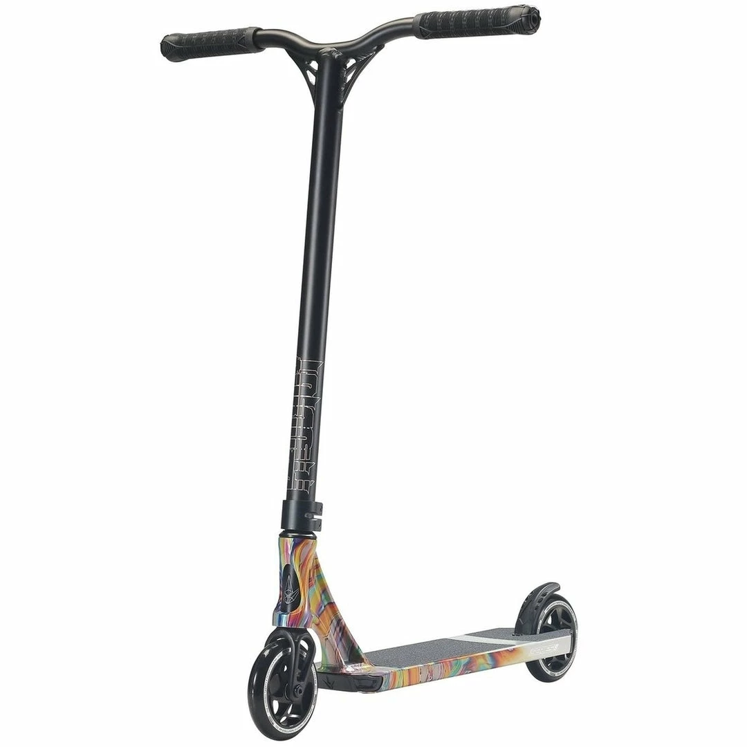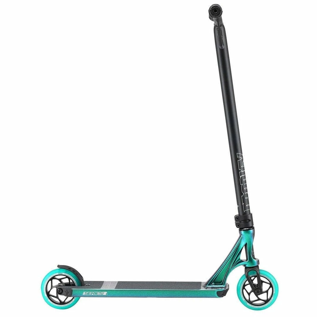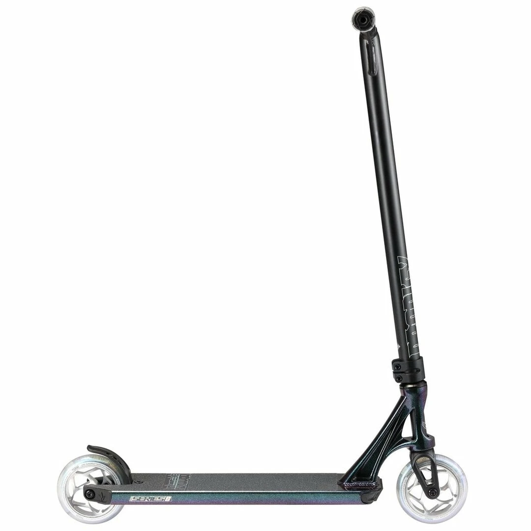 The Envy Prodigy S8 is built around a 4.72″ by 19.5″ deck with an 82.5 degree headtube angle. Because the deck does not have boxed ends, we consider the Prodigy Scooter deck to be a park deck but it’s equally at home at the skatepark or in your hood. PRO SCOOTER DECKS that are 19-19.99″ long will be ideal for intermediate to pro riders that have been in the sport for a while or for those scooter riders that need a little more footspace. The Prodigy S8 features oversized outer diameter Y-Bars that are 24.4″ tall by 20.5″ wide. Bars this size are ideal for riders who are 5 to 5.5 feet tall. Bars and forks are tied together via an IHC compression system, which is a favorite among pro scooter riders. Finally, the Envy Prodigy rolls on 120mm x 24mm wheels, which are very fast and used by most pro riders.If you are looking for a capable park scooter, the Envy Prodigy Complete might just be the scooter for you!