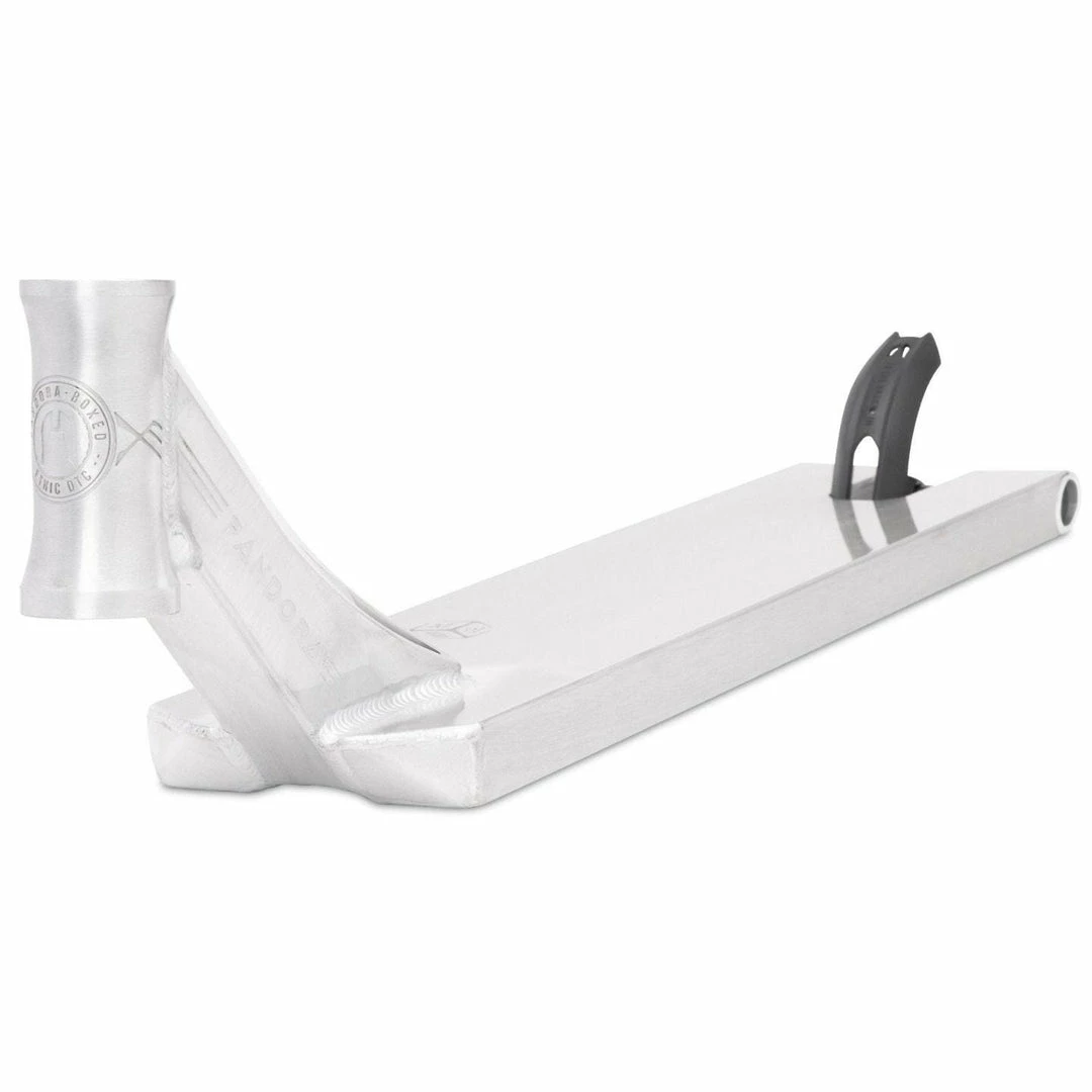 The Ethic Pandora Deck is 5.1″ wide by 20.5″ or 22″ long, with an 84 degree headtube angle. Headtube angle affects a couple of things. The steep rake of the Ethic Deck makes it perfect for those riders who have mastered the single tail whip and are moving onto multiple whips. The steeper the headtube angle, the more the Pandora Deck whips around a flat plane with less resistance. Because the deck has boxed ends, we consider the Ethic Scooter Deck to be a street deck but it’s equally at home at the skatepark or in your hood. PRO SCOOTER DECKS that are 22-22.99″ long will be ideal for intermediate to pro riders that have been in the sport for a while or for those scooter riders that need a little more footspace. The Ethic Pandora Scooter Deck works with the following wheel diameters: 100mm,110mm,115mm,120mm,125mm and the following wheel widths: 24mm,26mm,28mm,30mm. Note that decks typically come standard with 24mm spacers. If you change the wheel core width, you will also need to change your spacers to accomodate the new wheel core width.