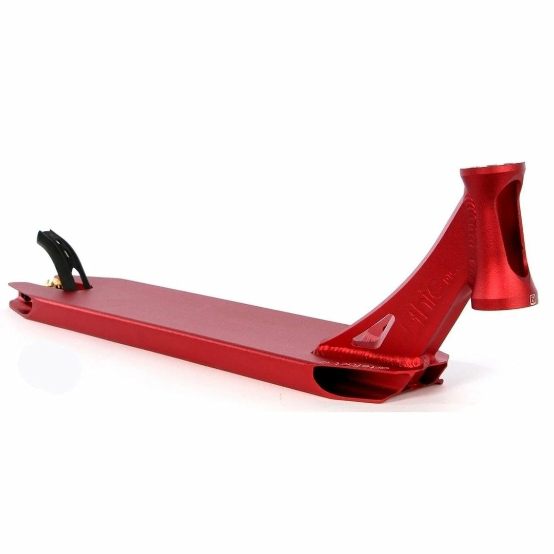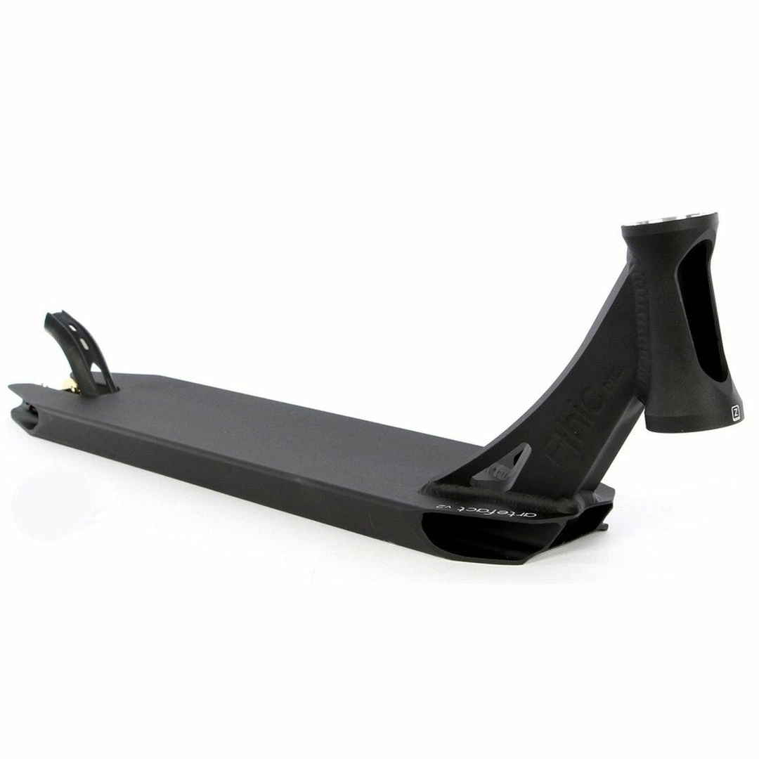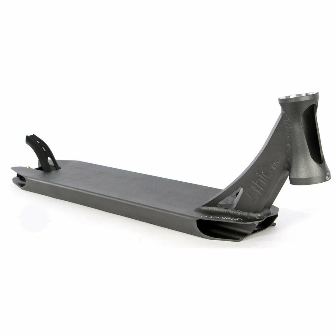The Ethic Artefact Deck is 4.6″ wide by 21.3″ long, with an 82.5 degree headtube angle. Headtube angle affects a couple of things. The longer rake of the Ethic Deck makes it perfect for those riders who want more stability and precise steering due to the longer rake of the headtube. Because the deck does not have boxed ends, we consider the Ethic Scooter Deck to be a park deck but it’s equally at home at the skatepark or in your hood. PRO SCOOTER DECKS that are 21-21.99″ long will be ideal for intermediate to pro riders that have been in the sport for a while or for those scooter riders that need a little more footspace. The Ethic Artefact V2 Deck works with the following wheel diameters: 100mm,110mm and the following wheel widths: 24mm. Note that decks typically come standard with 24mm spacers. If you change the wheel core width, you will also need to change your spacers to accomodate the new wheel core width.