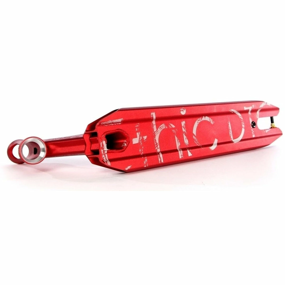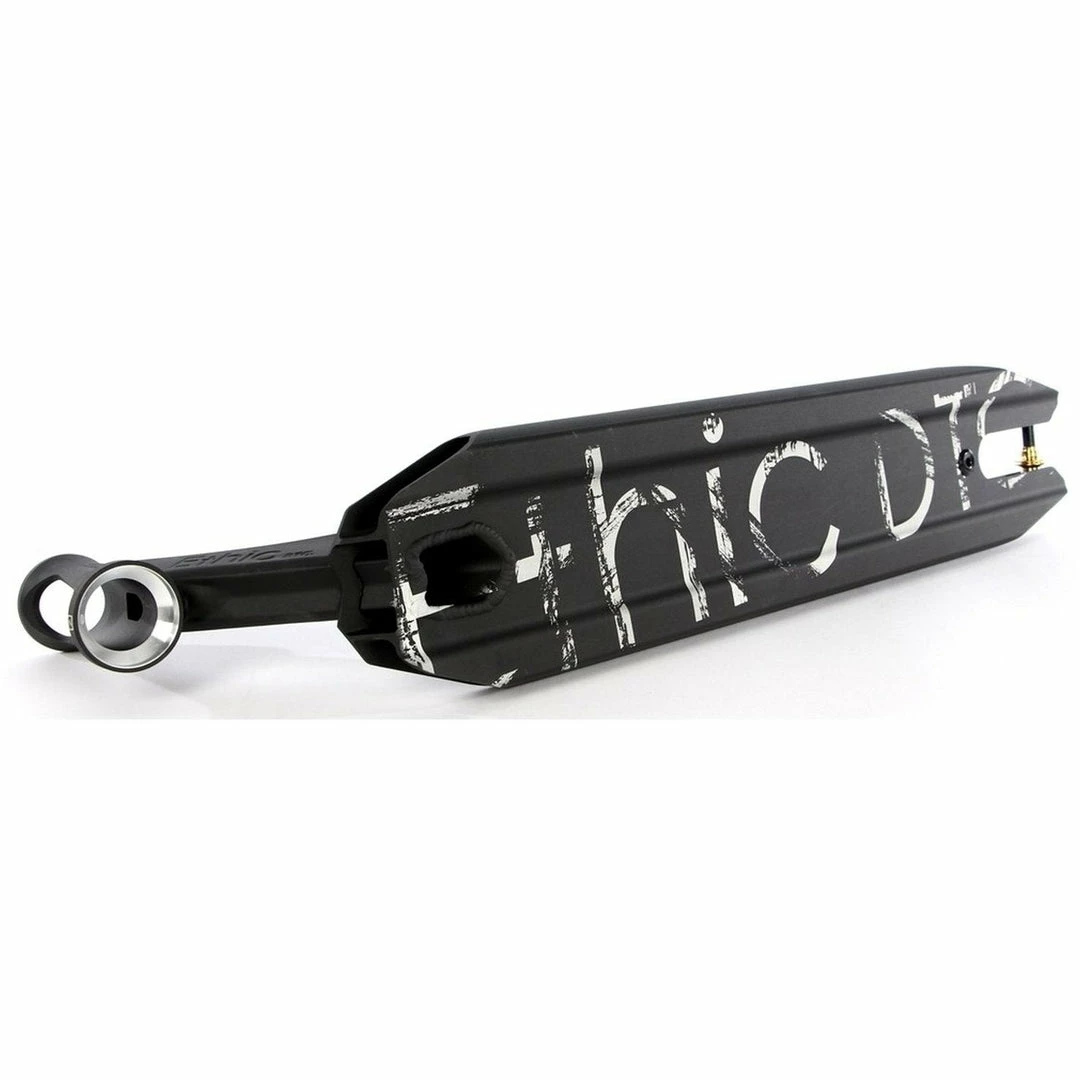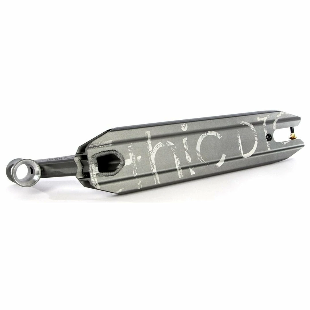 The Ethic Artefact Deck is 4.6″ wide by 21.3″ long, with an 82.5 degree headtube angle. Headtube angle affects a couple of things. The longer rake of the Ethic Deck makes it perfect for those riders who want more stability and precise steering due to the longer rake of the headtube. Because the deck does not have boxed ends, we consider the Ethic Scooter Deck to be a park deck but it’s equally at home at the skatepark or in your hood. PRO SCOOTER DECKS that are 21-21.99″ long will be ideal for intermediate to pro riders that have been in the sport for a while or for those scooter riders that need a little more footspace. The Ethic Artefact V2 Deck works with the following wheel diameters: 100mm,110mm and the following wheel widths: 24mm. Note that decks typically come standard with 24mm spacers. If you change the wheel core width, you will also need to change your spacers to accomodate the new wheel core width.