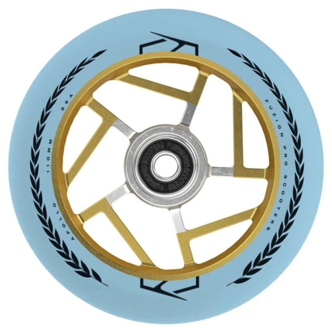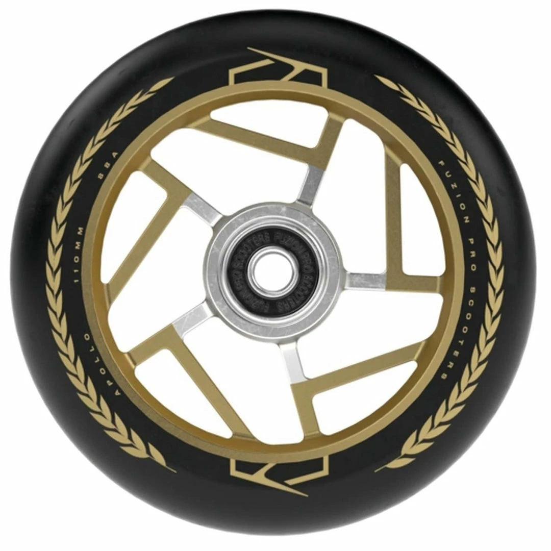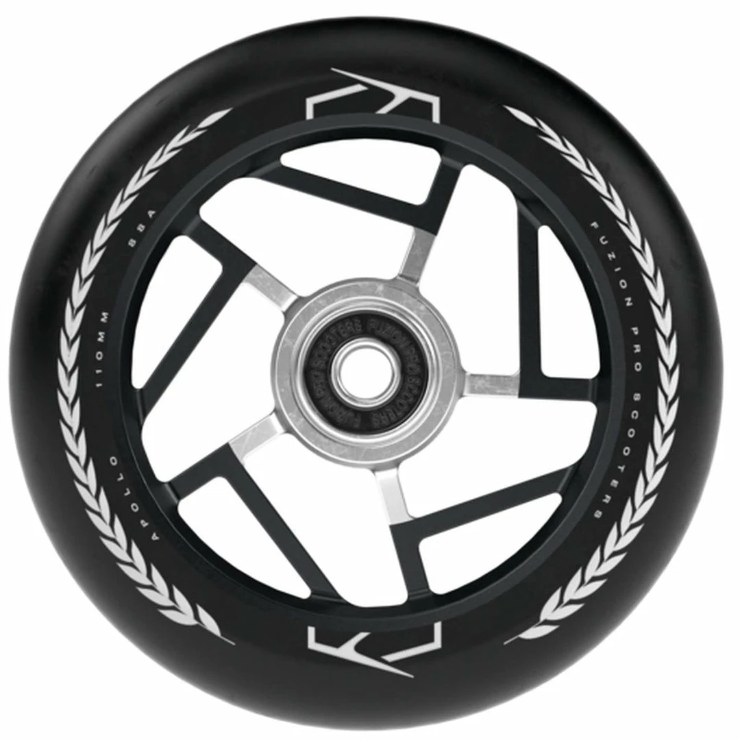 Fuzion Apollo Wheels are 88A PU, which means that Fuzion intended them to be ridden on the street because they are harder and more durable than 86A wheels. Fuzion Scooter Wheels are 24mm wide at the core and should be used with 24mm wheels spacers. The PU width is 24mm. Most PRO SCOOTER FORKS and decks were designed to handle a 24mm wheel core. Since both the core and PU of the Fuzion Scooter Wheels are 24mm, every fork and deck we sell should be compatible with these wheels. Fuzion Apollo Wheels have a 110mm outer diameter, making them perfect for the advanced beginner to intermediate riders. 110mm wheels have long been the standard diameter for most intermediate pro scooters. However, as scooter wheels become wider and taller due to pro riders need for big trick speed, 110mm wheels are becoming the norm for beginner to intermediate scooter riders. Fuzion Apollo Wheels 110mm come standard with pre-installed bearings.