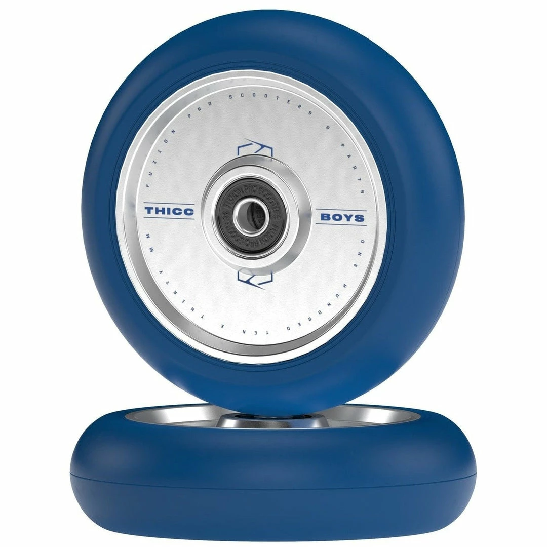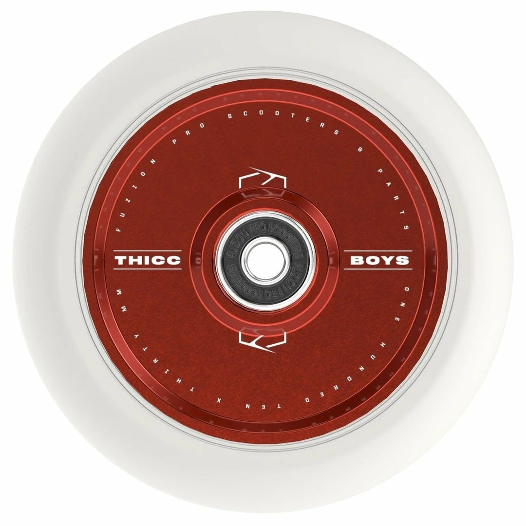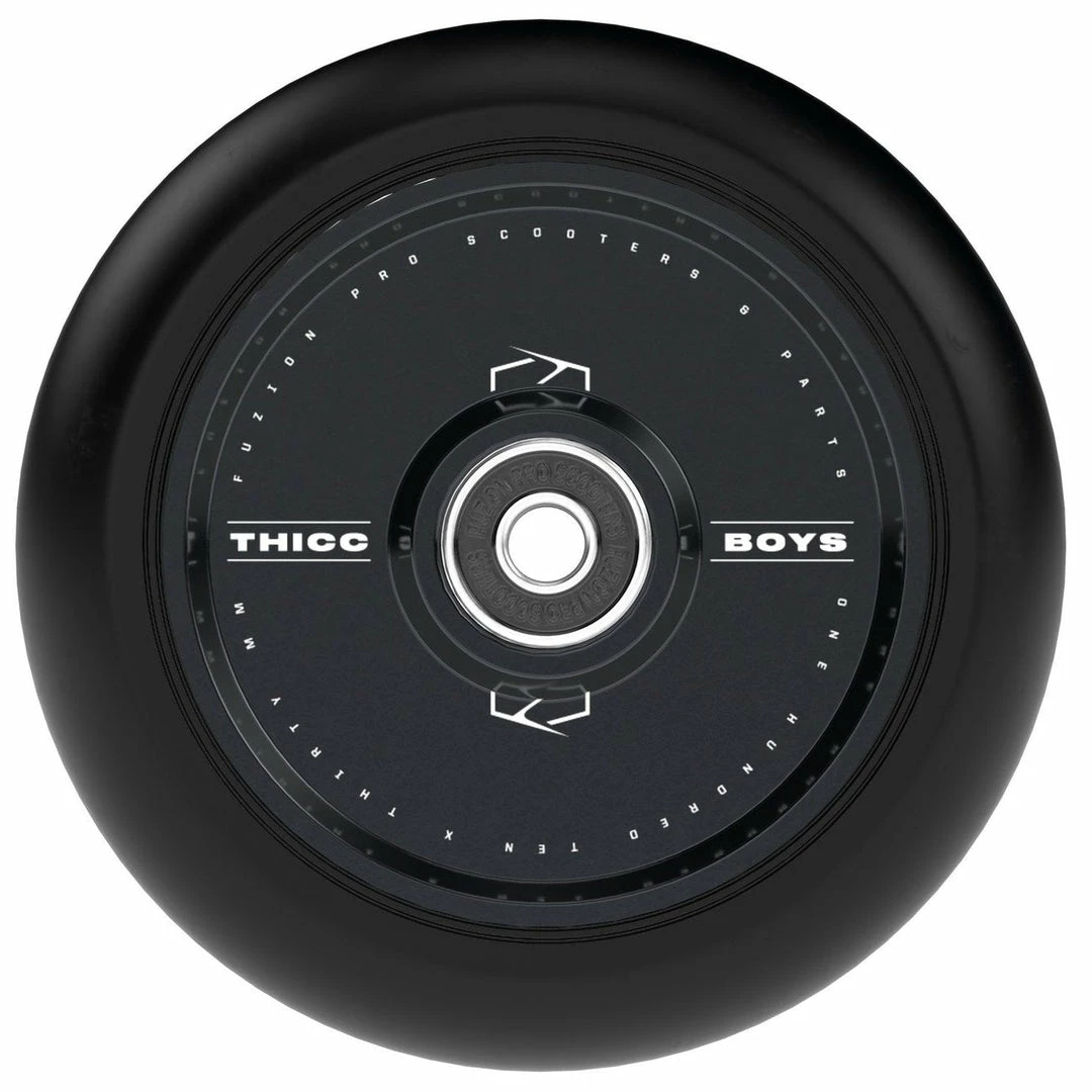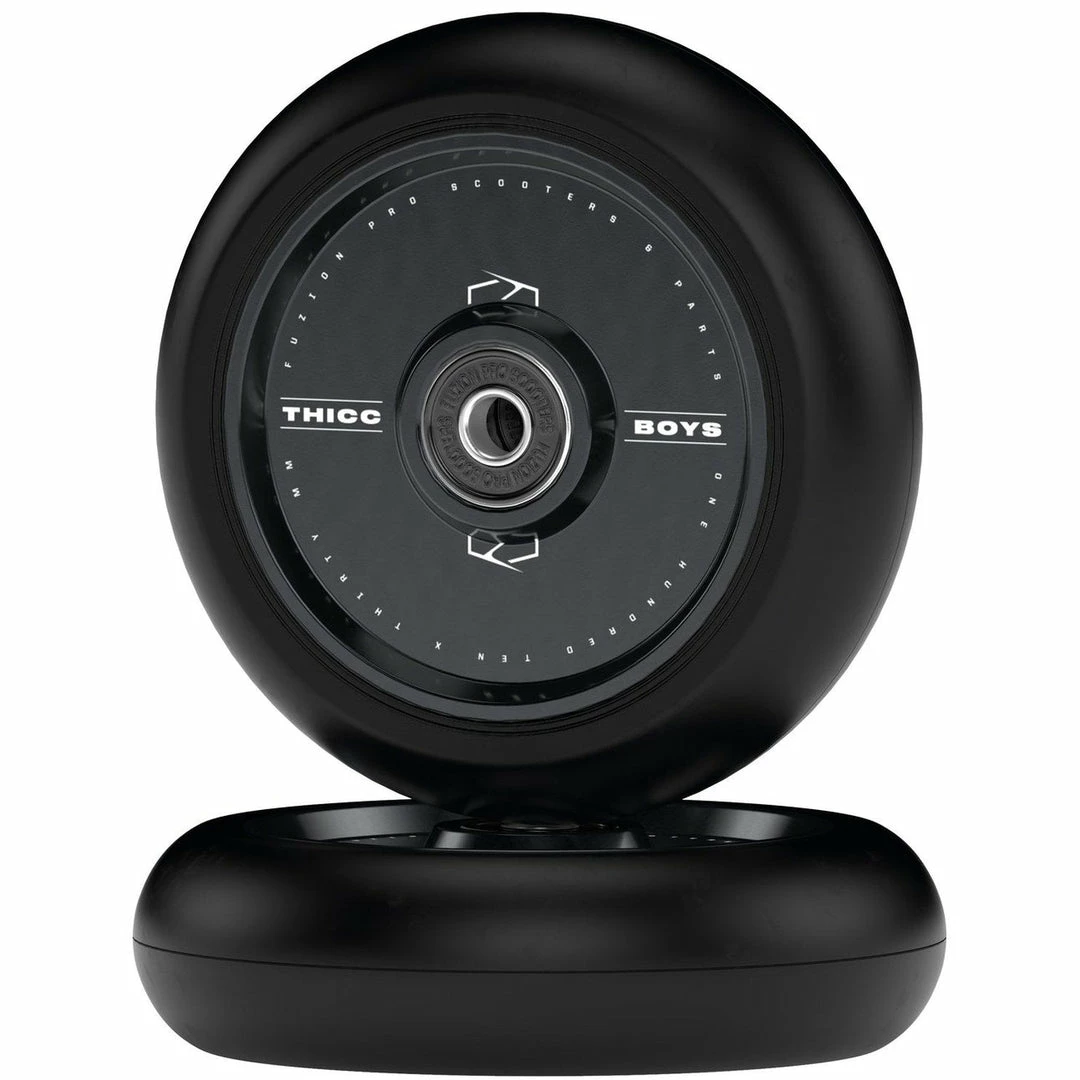 Fuzion Thiccboys Wheels are 88A PU, which means that Fuzion intended them to be ridden on the street because they are harder and more durable than 86A wheels. Fuzion Scooter Wheels are 30mm wide at the core and should be used with 30mm wheels spacers. The PU width is 30mm. Most PRO SCOOTER FORKS and decks were designed to handle a 24mm wheel core. 30mm wheels are the new favorite of pro scooter riders due to their massive grip. While they are going to feel a little strange at first if you are used to riding 24mm wide wheels, you will soon learn to love the massive grip that they offer! But beware, since 30mm wheels are relatively new to market, make sure both your deck and forks can handle a 30mm wide wheel.Fuzion Thiccboys Wheels have a 110mm outer diameter, making them perfect for the advanced beginner to intermediate riders. 110mm wheels have long been the standard diameter for most intermediate pro scooters. However, as scooter wheels become wider and taller due to pro riders need for big trick speed, 110mm wheels are becoming the norm for beginner to intermediate scooter riders. Fuzion Thiccboys Wheels 110mm come standard with pre-installed bearings.
