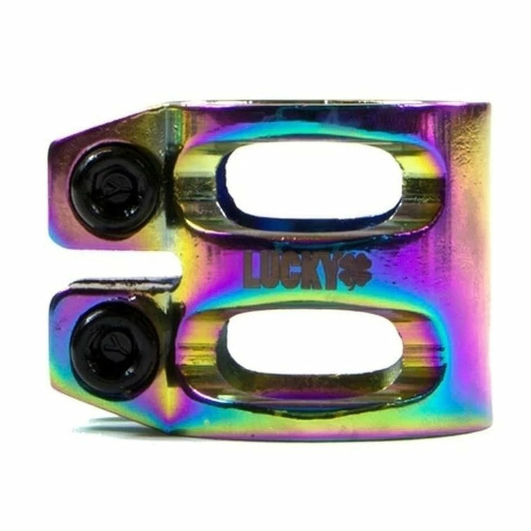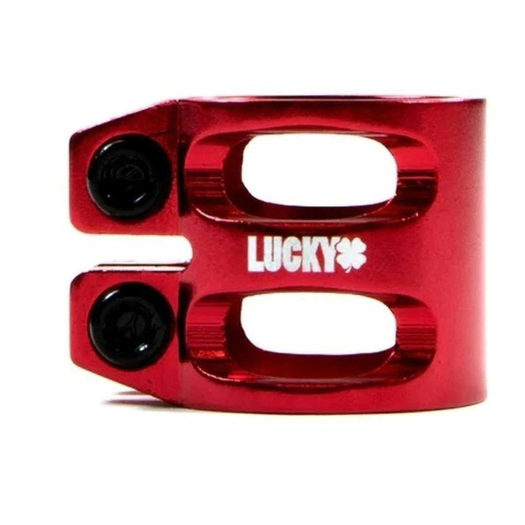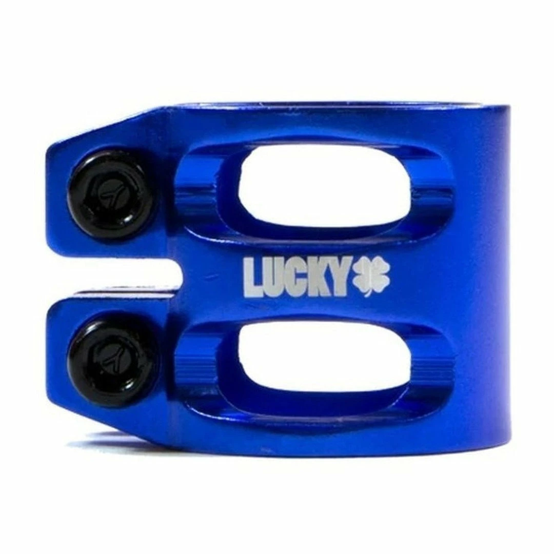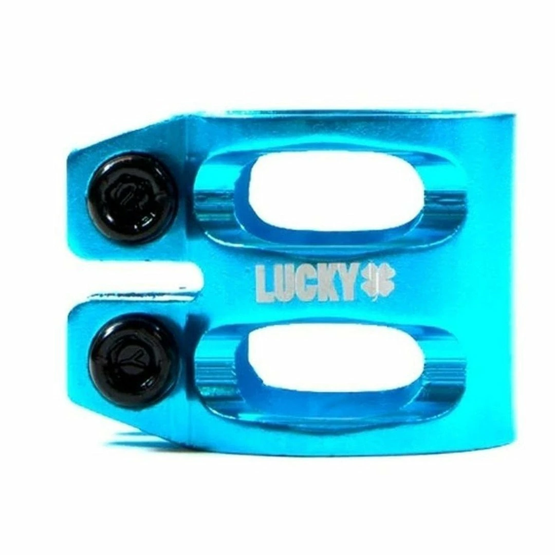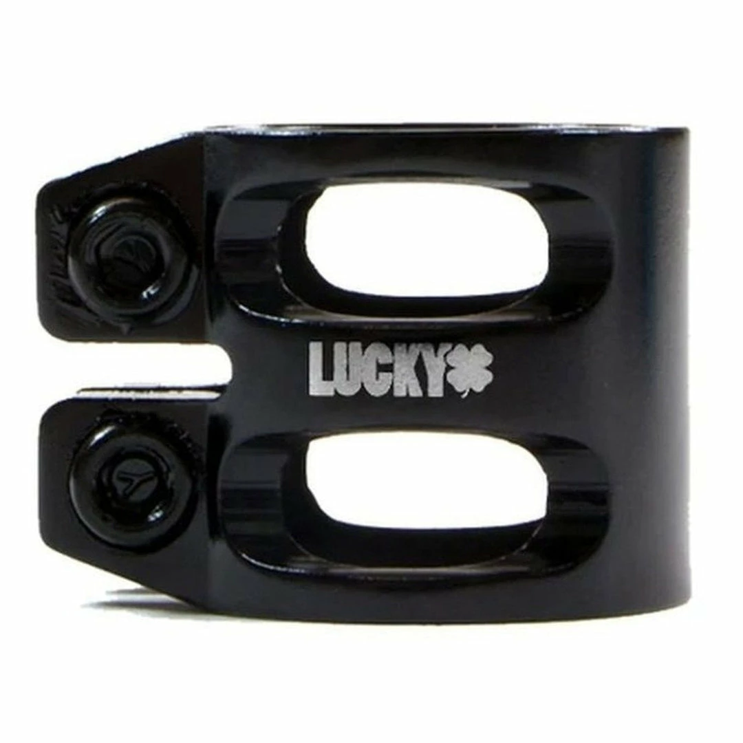 - Most of Lucky’s bars are oversized so it’s appropriate that they have a double clamp that works with oversized bars with a slit. The DUBL clamp is a light weight double clamp that features quite a few cutouts to reduce weight without sacrificing clamping power and durability. Lucky clamps use 6000 series aircraft aluminum and CNC machine it to create the cutouts, resulting in an attractive, light weight clamp. The Lucky clamp is a double clamp. Double clamps are super light weight and the choice of most pro scooter riders, whether they ride street or park. Double clamps only have 2 bolts to compress your bars around your forks so, while they are effective, a triple or quad clamp will provide more clamping power and reduce the frequency with which you will have to tighten your clamp bolts. The Lucky double clampThe Lucky scooter clamp includes standard M6 bolts, which provide adequate clamping power but can strip if overtightened. It is a good practice with any compression bolt to tighten each bolt 1/2 turn at a time, one bolt at a time, until all bolts are completely tight. The Lucky DUBL Clamp works with the following types of compression: IHC,ICS,ICS10,HIC,TCS. If you are looking for a very light weight scooter clamp, the Lucky DUBL 2 bolt clamp just might be the perfect clamp for you!