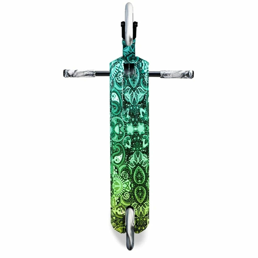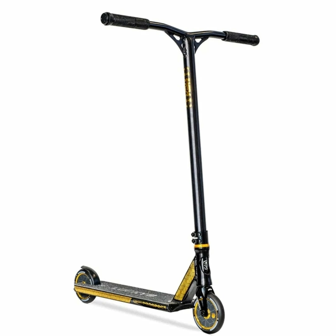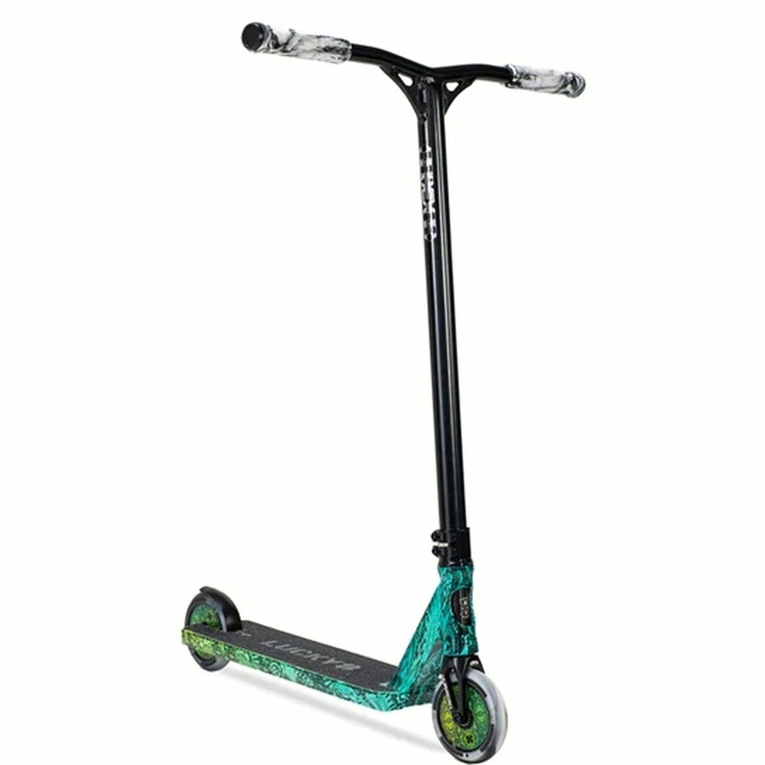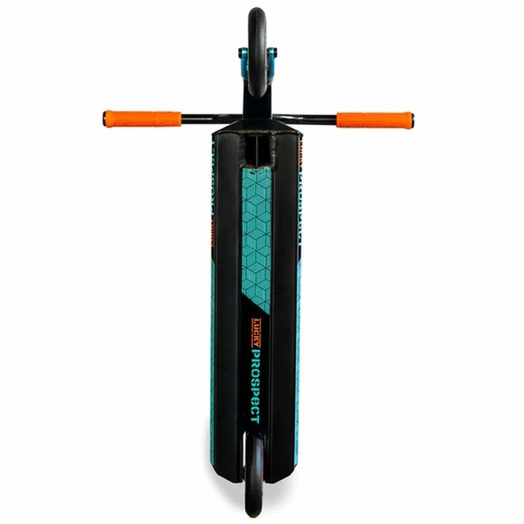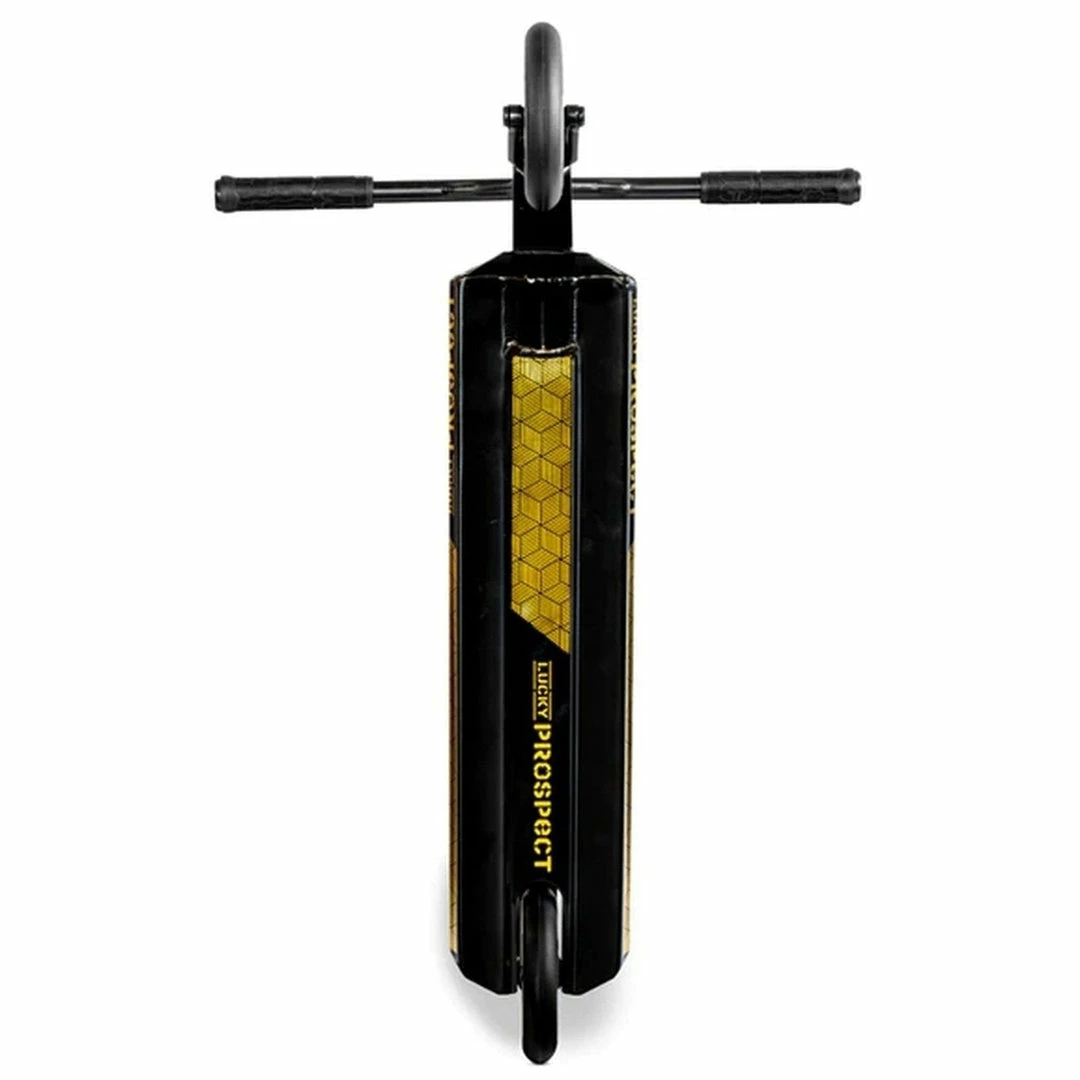 The Lucky Prospect Scooter is built around a 4.8″ by 19.5″ deck with an 82.5 degree headtube angle. Because the deck does not have boxed ends, we consider the Prospect Scooter deck to be a park deck but it’s equally at home at the skatepark or in your hood. PRO SCOOTER DECKS that are 19-19.99″ long will be ideal for intermediate to pro riders that have been in the sport for a while or for those scooter riders that need a little more footspace. The Lucky Prospect Complete features oversized outer diameter Y-Bars that are 24.5″ tall by 23.5″ wide. Bars this size are ideal for riders who are 5 to 5.5 feet tall. Bars and forks are tied together via an IHC compression system, which is a favorite among pro scooter riders. Finally, the Lucky Prospect rolls on 120mm x 24mm wheels, which are very fast and used by most pro riders.If you are looking for a capable park scooter, the Lucky Prospect Complete Scooter might just be the scooter for you!