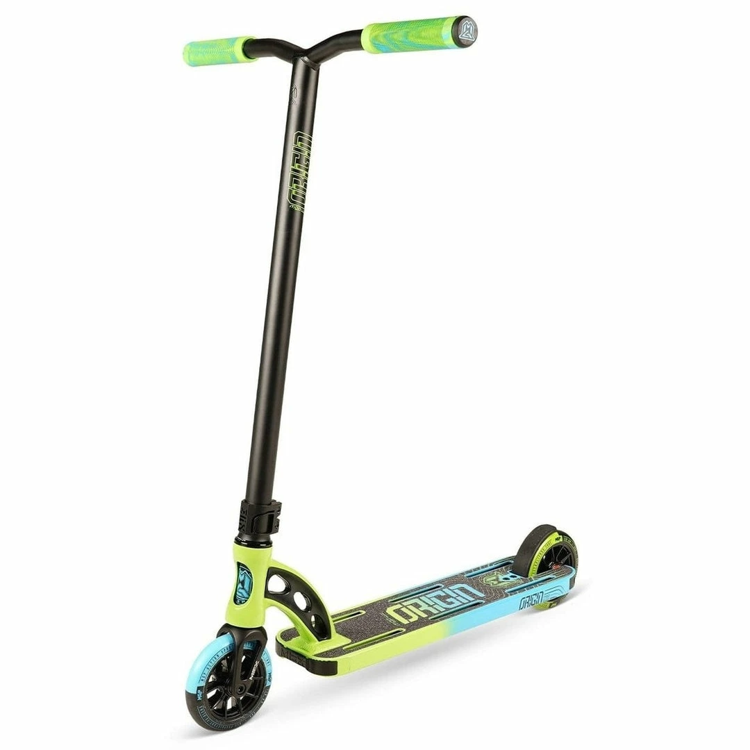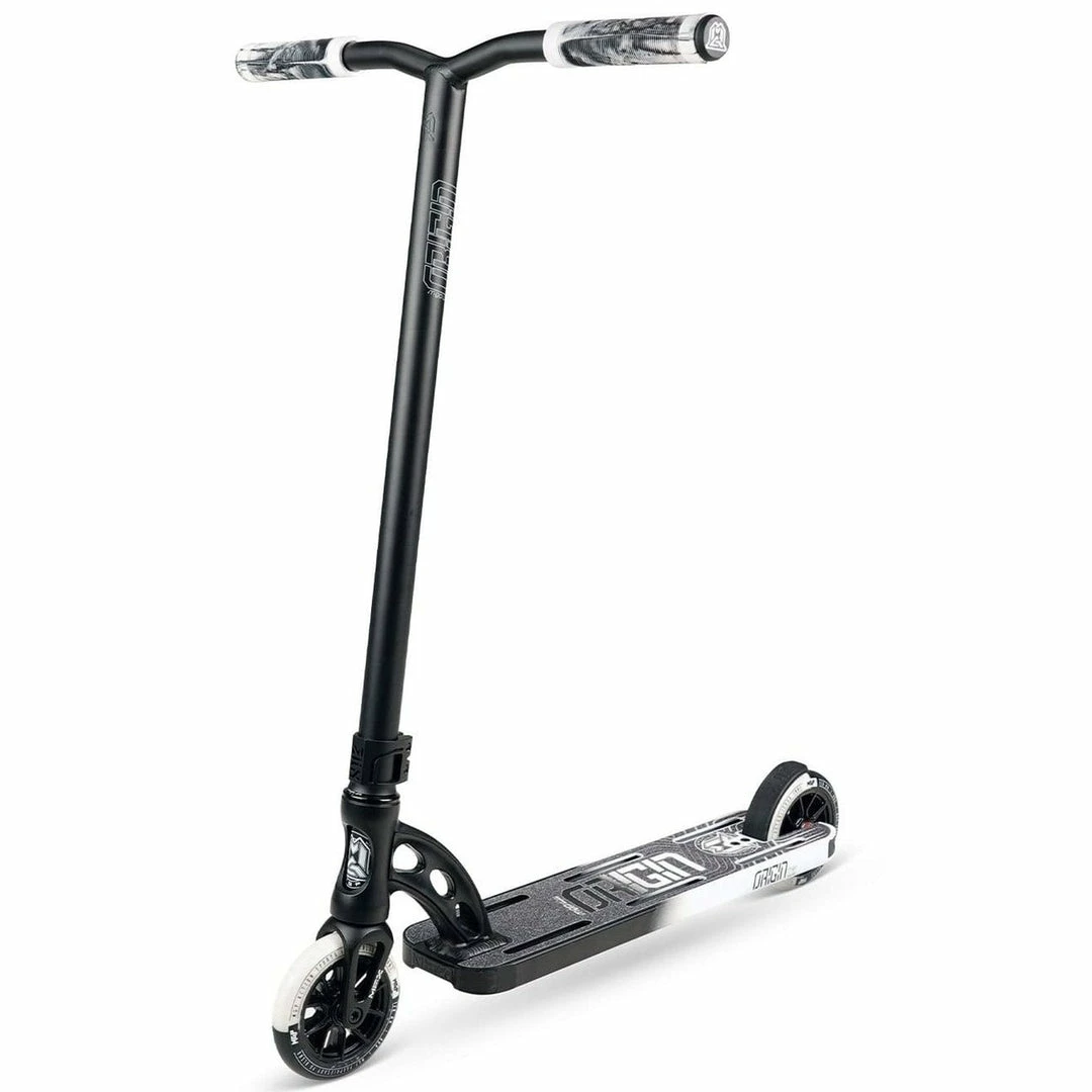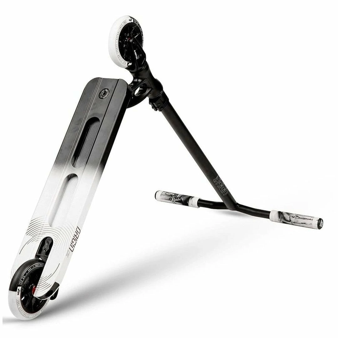 The Madd Gear Origin Scooter is built around a 5″ by 19.5″ deck with an 83 degree headtube angle. Because the deck does not have boxed ends, we consider the Origin Pro Scooter deck to be a park deck but it’s equally at home at the skatepark or in your hood. PRO SCOOTER DECKS that are 19-19.99″ long will be ideal for intermediate to pro riders that have been in the sport for a while or for those scooter riders that need a little more footspace. The Madd Gear Origin Complete features standard outer diameter Y-Bars that are 23″ tall by 21″ wide. Bars this size are ideal for riders who are 4.5 to 5 feet tall. Bars and forks are tied together via an IHC compression system, which is a favorite among pro scooter riders. Finally, the Madd Gear Origin Pro rolls on 120mm x 24mm wheels, which are very fast and used by most pro riders.If you are looking for a capable park scooter, the Madd Gear Origin Complete Scooter might just be the scooter for you!