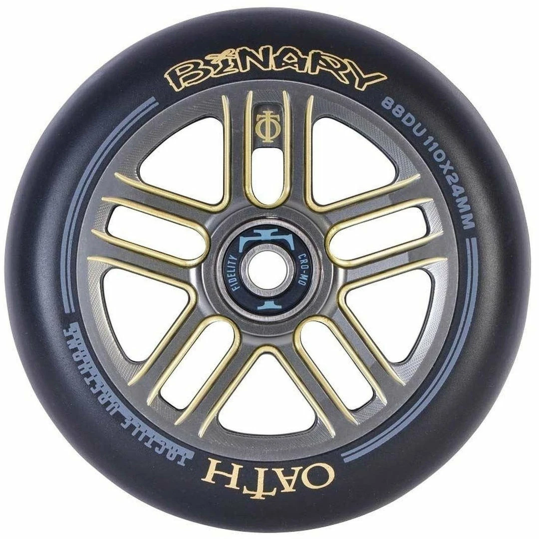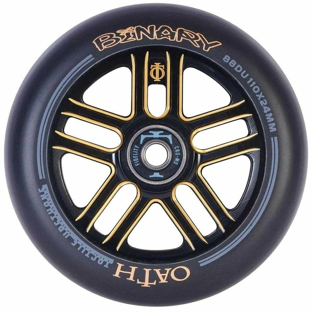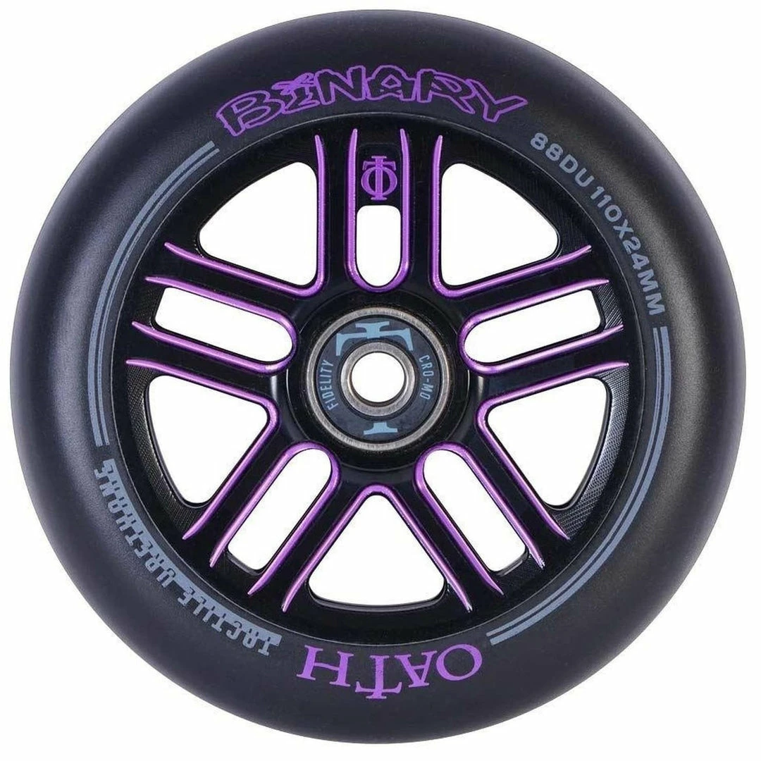 Oath Binary Wheels are 88A PU, which means that Oath intended them to be ridden on the street because they are harder and more durable than 86A wheels. Oath Scooter Wheels are 30mm wide at the core and should be used with 30mm wheels spacers. The PU width is 30mm. Most PRO SCOOTER FORKS and decks were designed to handle a 24mm wheel core. 30mm wheels are the new favorite of pro scooter riders due to their massive grip. While they are going to feel a little strange at first if you are used to riding 24mm wide wheels, you will soon learn to love the massive grip that they offer! But beware, since 30mm wheels are relatively new to market, make sure both your deck and forks can handle a 30mm wide wheel.Oath Binary Wheels have a 115mm outer diameter, making them perfect for the intermediate to pro riders who are looking for maximum speed for big air park tricks. While 115mm and 125mm are only produced by a few scooter manufacturers, 120mm wheels are the norm now on any intermediate to pro freestyle scooter. Oath Binary Wheels 115mm come standard with pre-installed bearings.