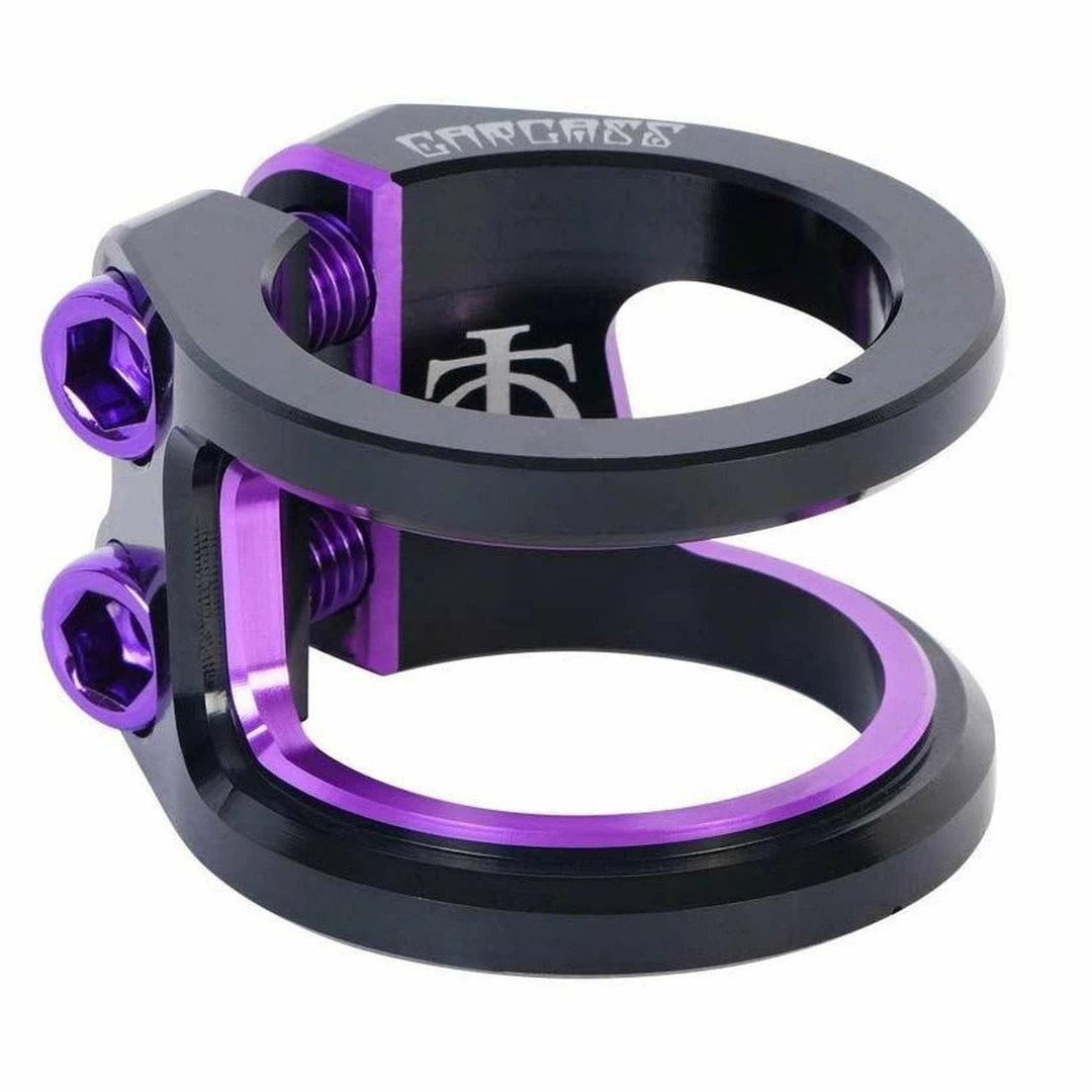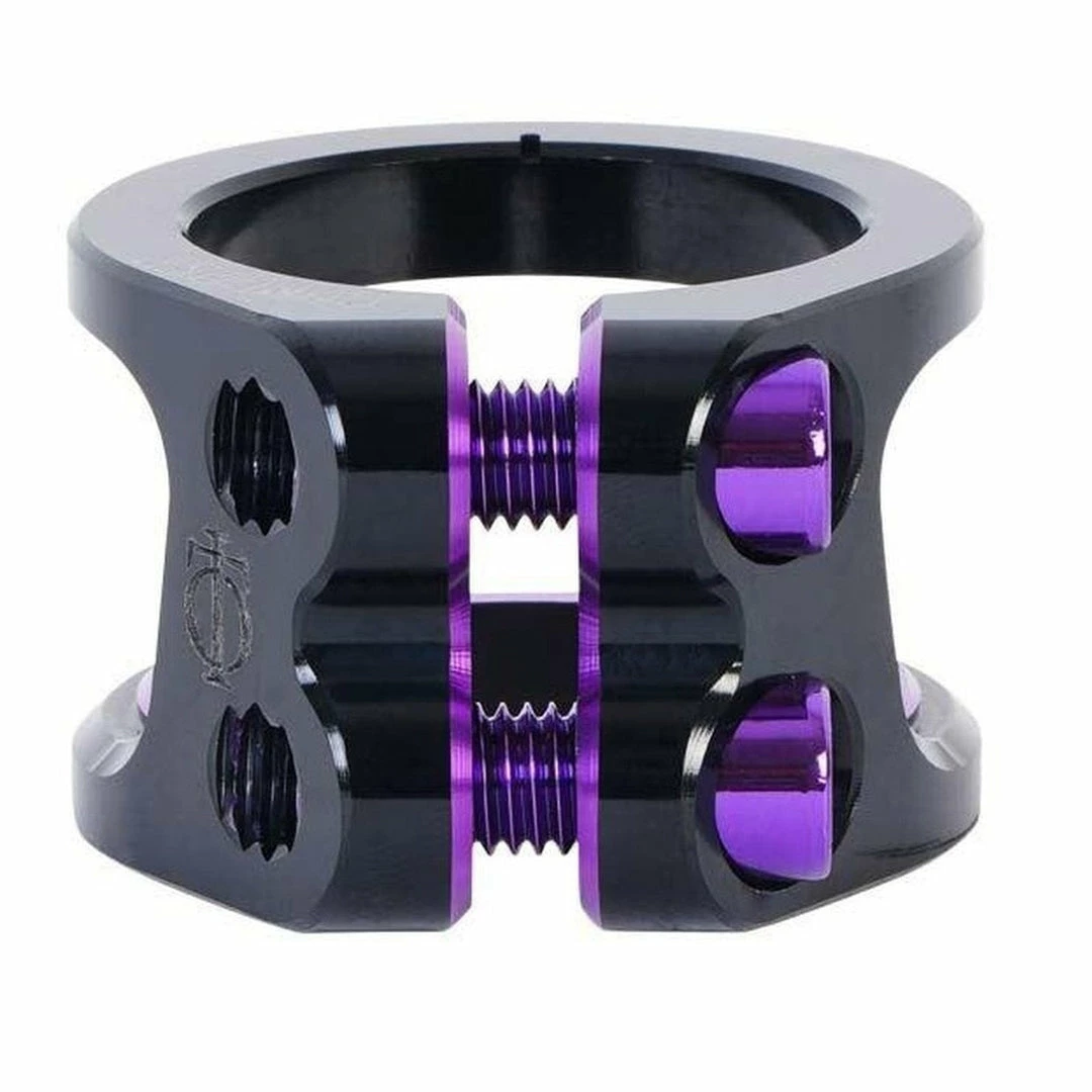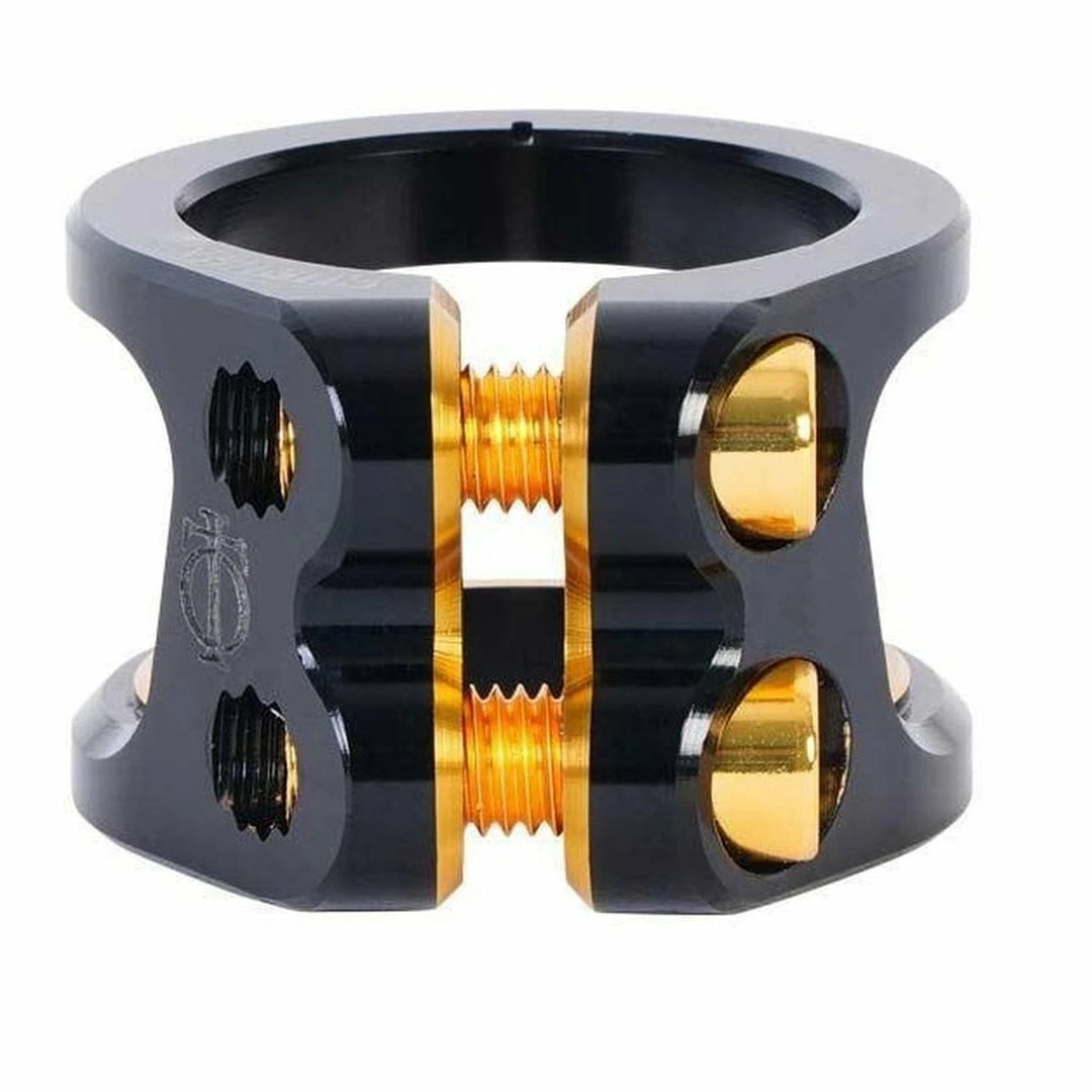 - If light weight is your primary focus on your pro scooter, then look no further than the all new Oath Carcass double clamp. It looks fantastic and is one of the lightest double clamps on the market today. You may be concerned about clamping power since there isn’t much to this clamp but, fear not, the M8 bolts provide just as much clamping power as any other double clamp on the market. The Oath clamp is a double clamp. Double clamps are super light weight and the choice of most pro scooter riders, whether they ride street or park. Double clamps only have 2 bolts to compress your bars around your forks so, while they are effective, a triple or quad clamp will provide more clamping power and reduce the frequency with which you will have to tighten your clamp bolts. The Oath double clamp includes a shim and works with both oversized and standard outer diameter PRO SCOOTER BARS with a slit. The Oath scooter clamp includes M8 bolts for maximum clamping power. M8 bolts are much less likely to strip than M6 bolts. It is a good practice with any compression bolt to tighten each bolt 1/2 turn at a time, one bolt at a time, until all bolts are completely tight. The Oath Carcass Clamp works with the following types of compression: IHC,ICS,ICS10,HIC,TCS. If you are looking for a very light weight scooter clamp, the Oath Carcass 2 bolt clamp just might be the perfect clamp for you!