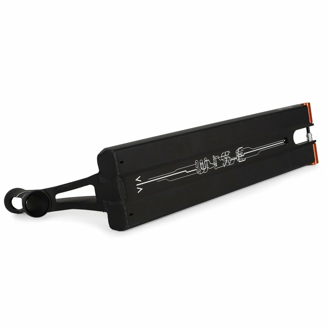 The Wise VIA Deck is 5.7″ wide by 22″ or 23″ long, with an 84 degree headtube angle. Headtube angle affects a couple of things. The steep rake of the Wise Deck makes it perfect for those riders who have mastered the single tail whip and are moving onto multiple whips. The steeper the headtube angle, the more the VIA Deck whips around a flat plane with less resistance. Because the deck has boxed ends, we consider the Wise Scooter Deck to be a street deck but it’s equally at home at the skatepark or in your hood. PRO SCOOTER DECKS that are 23+” long will be ideal for intermediate to pro riders that have been in the sport for a while or for those scooter riders that need a little more footspace. The Wise VIA Scooter Deck works with the following wheel diameters: 100mm,110mm,115mm,120mm,125mm and the following wheel widths: 24mm,26mm. Note that decks typically come standard with 24mm spacers. If you change the wheel core width, you will also need to change your spacers to accomodate the new wheel core width.