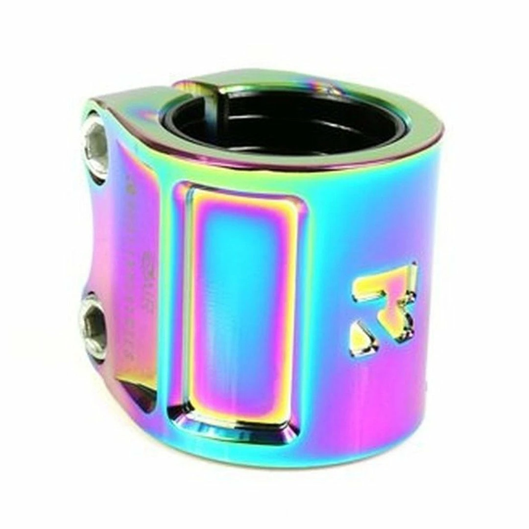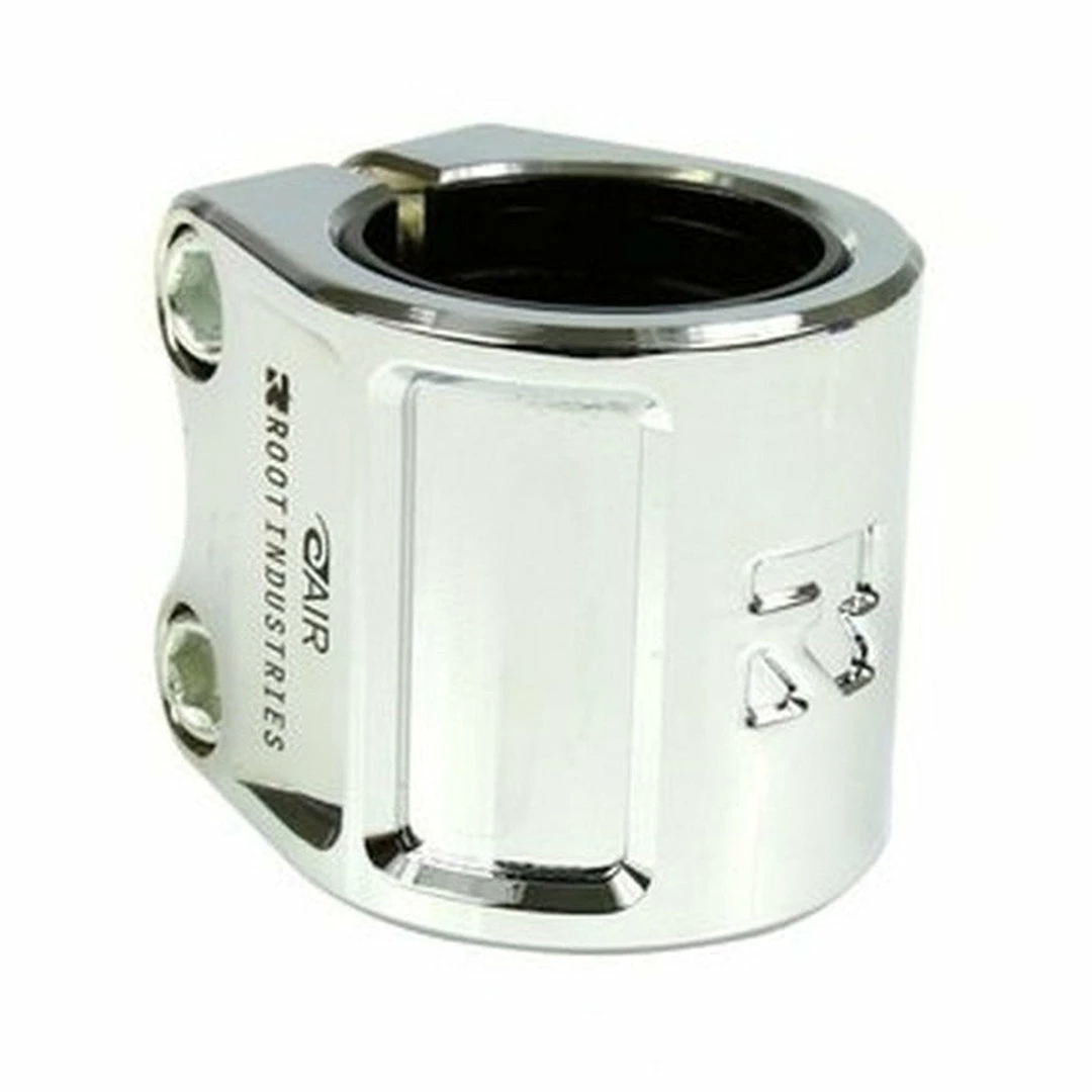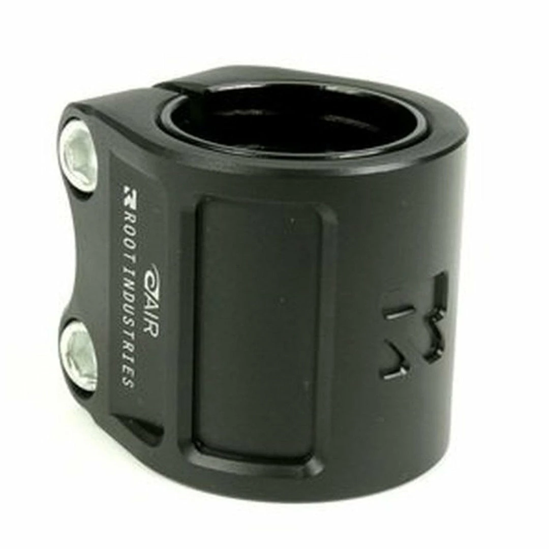 - The AIR moniker that Root employed in its current lineup holds true for all of their pro scooter parts but, perhaps notquite as true as with the Root AIR double clamp. Each AIR Double Clamp is forged out of aluminum, laser-etched and built to last. Featuring 6mm drive steel bolts and a convenient shim for oversized/standard compatibility, the AIR Double Clamp is easy to install and will provide solid compression with little to no maintenance. The Root Industries AIR Double Clamp is a stylish and effective choice that compliments any handlebar design while keeping your scooter dialed. The Root Industries clamp is a double clamp. Double clamps are super light weight and the choice of most pro scooter riders, whether they ride street or park. Double clamps only have 2 bolts to compress your bars around your forks so, while they are effective, a triple or quad clamp will provide more clamping power and reduce the frequency with which you will have to tighten your clamp bolts. The Root Industries double clamp includes a shim and works with both oversized and standard outer diameter PRO SCOOTER BARS with a slit. The Root Industries scooter clamp includes M8 bolts for maximum clamping power. M8 bolts are much less likely to strip than M6 bolts. It is a good practice with any compression bolt to tighten each bolt 1/2 turn at a time, one bolt at a time, until all bolts are completely tight. The Root Industries AIR Clamp works with the following types of compression: IHC,ICS,ICS10,HIC,TCS. If you are looking for a very light weight scooter clamp, the Root Industries AIR 2 bolt clamp just might be the perfect clamp for you!