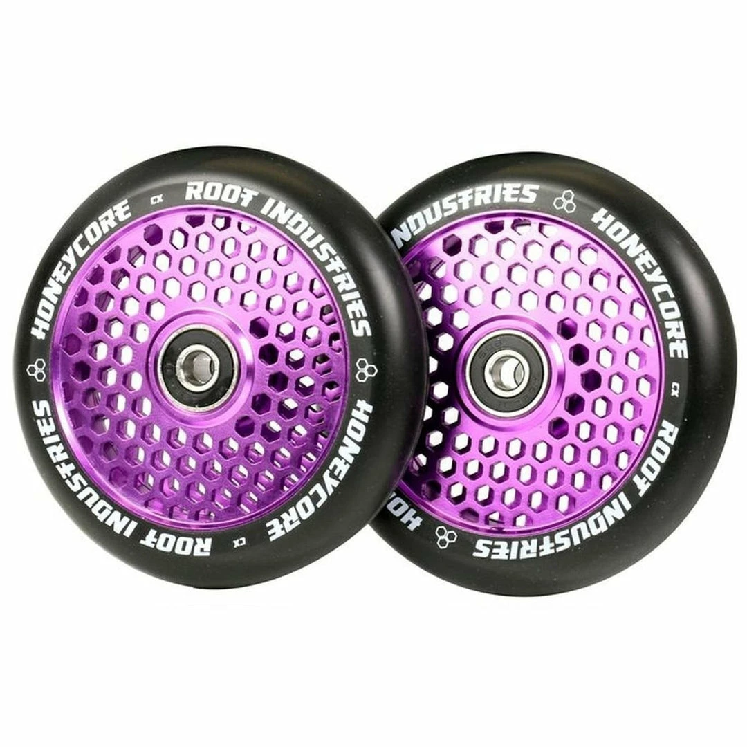 Root Industries pushes the performance envelope when designing new products but the Honeycore wheels are their piece de resistance. Hollow Core wheels had been around for several years before the Honeycores were launched by Root. Hollow cores are desirable by pro riders and amateurs alike because they are incredibly light weight when compared to their machined core counterparts. Root loved the hollow core wheel but took it to the extreme by putting a couple hundred holes in the core. We were skeptical about whether or not the holes in the core would impact rigidity or strength but Root tested heavily and somehow pulled off producing the lightest scooter wheel on the market without compromising the structural integrity.