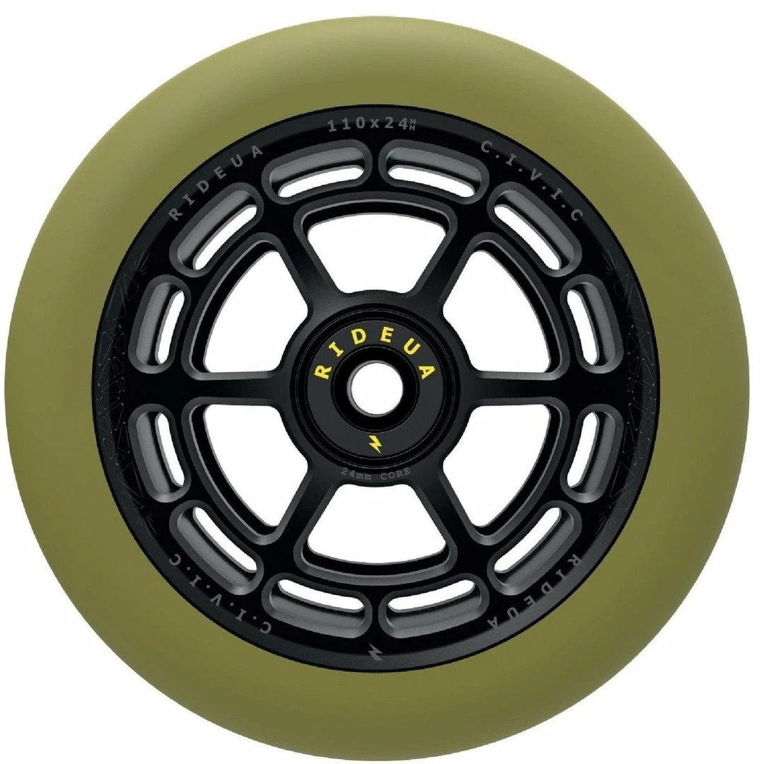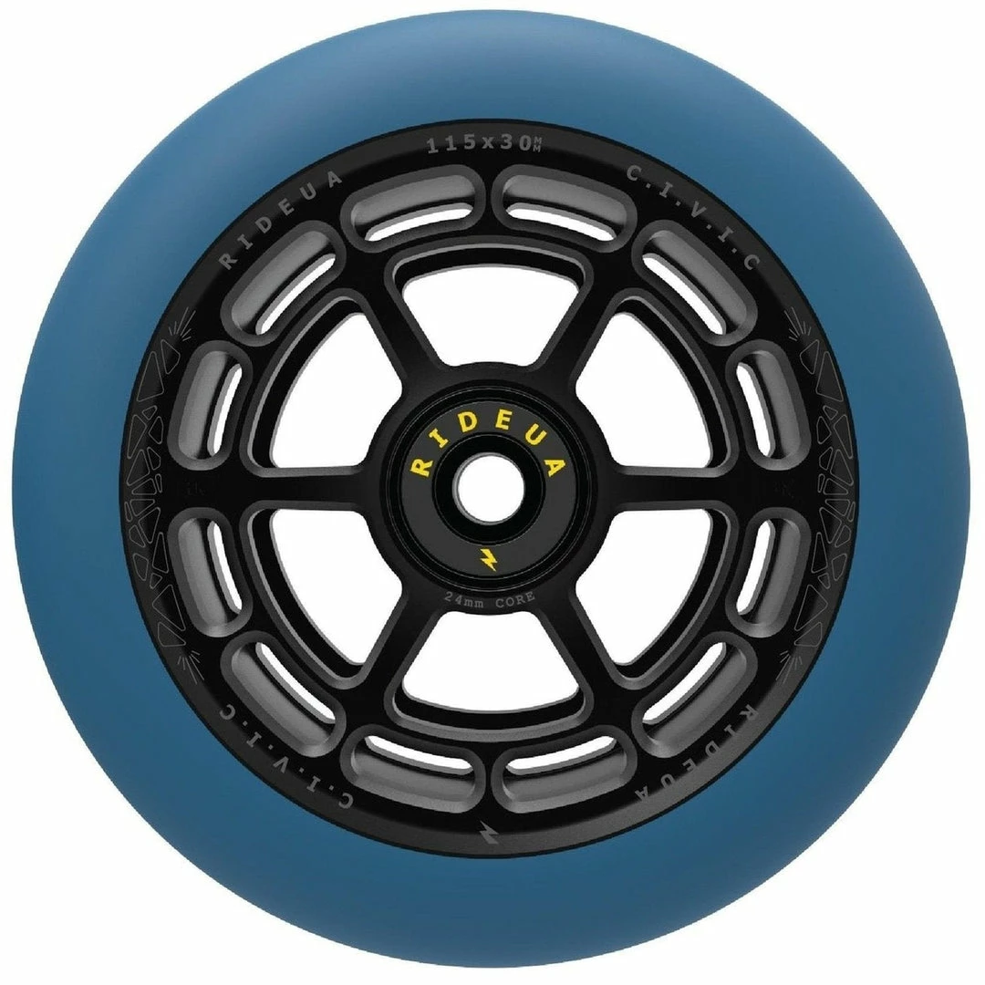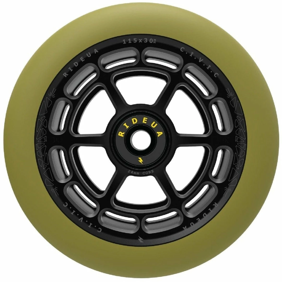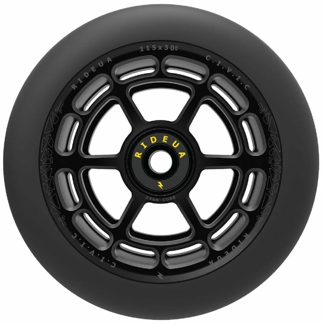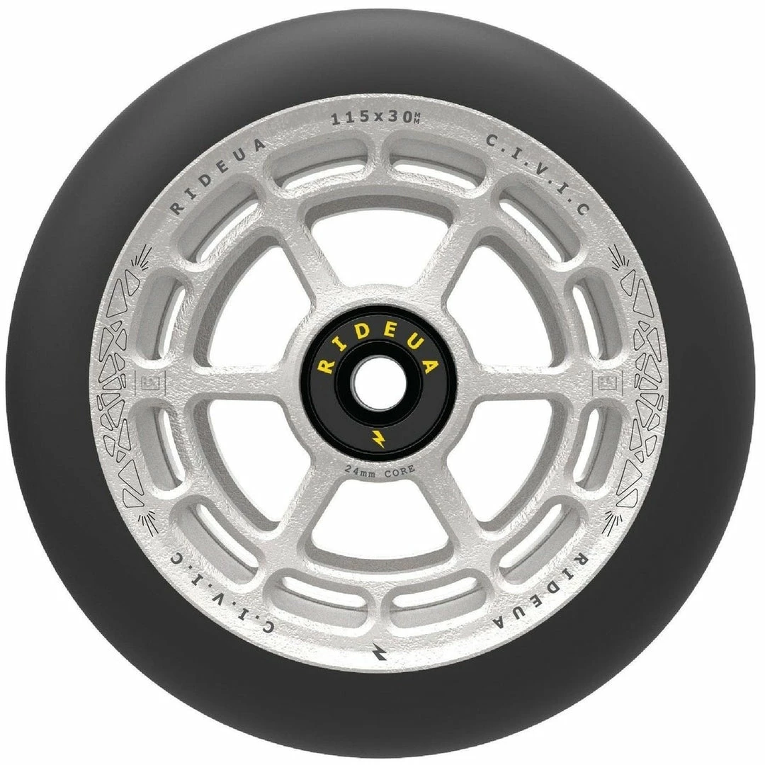 UrbanArtt Civic Wheels are 88A PU, which means that UrbanArtt intended them to be ridden on the street because they are harder and more durable than 86A wheels. UrbanArtt Scooter Wheels are 24mm wide at the core and should be used with 24mm wheels spacers. The PU width is 30mm. Most PRO SCOOTER FORKS and decks were designed to handle a 24mm wheel core. Very few wheels come in this unique core/PU combo with a 24mm core and 30mm PU. Not all forks and decks were designed to handle a 24mm core and 30mm PU so make sure that both your deck and forks can handle the width of a 30mm wide wheel. You will still use 24mm fork/deck spacers. Only a few manufacturers, primarily Root Industries, makes this combo core/PU width and these wheels were intended only to be used with their forks. UrbanArtt Civic Wheels have a 125mm outer diameter, making them perfect for the intermediate to pro riders who are looking for maximum speed for big air park tricks. While 115mm and 125mm are only produced by a few scooter manufacturers, 120mm wheels are the norm now on any intermediate to pro freestyle scooter. UrbanArtt Civic Wheels 125mm come standard with pre-installed bearings.