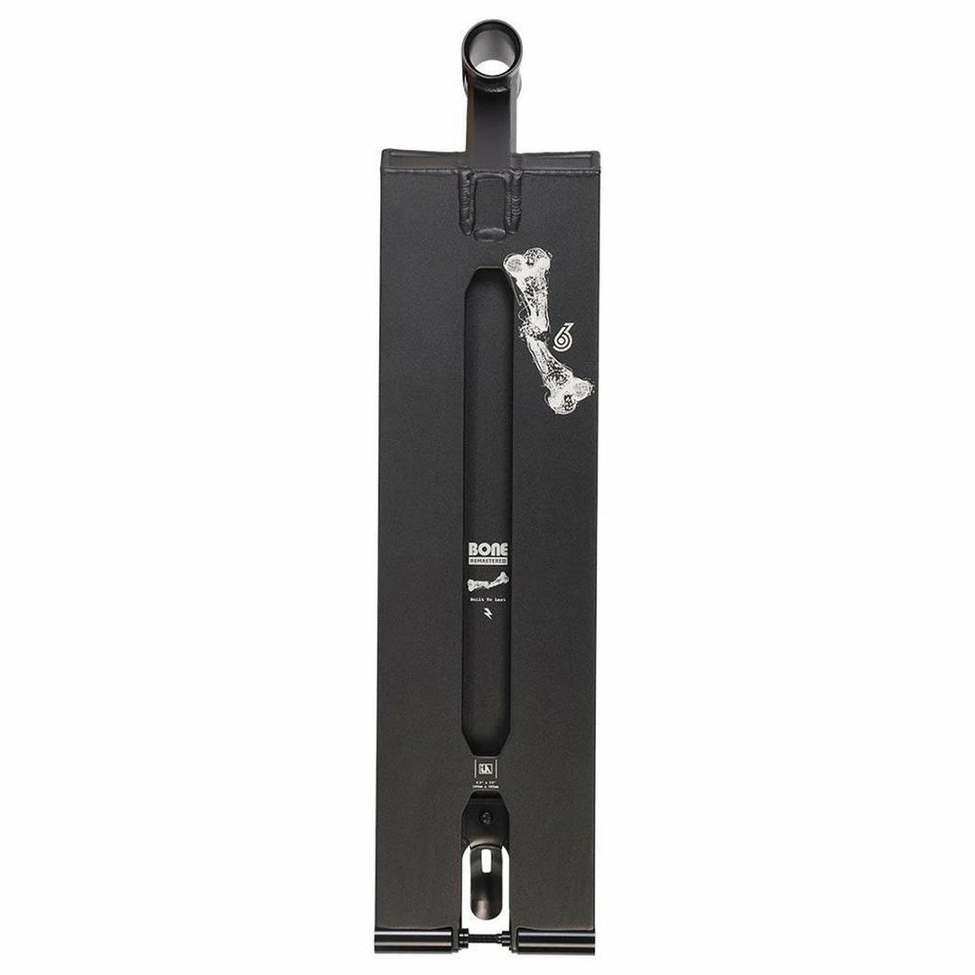 The UrbanArtt Bone Deck is 6.3″ wide by 23″ long, with an 83 degree headtube angle. Headtube angle affects a couple of things. The steep rake of the UrbanArtt Deck makes it perfect for those riders who have mastered the single tail whip and are moving onto multiple whips. The steeper the headtube angle, the more the Bone Deck whips around a flat plane with less resistance. Because the deck has boxed ends, we consider the UrbanArtt Scooter Deck to be a street deck but it’s equally at home at the skatepark or in your hood. PRO SCOOTER DECKS that are 23+” long will be ideal for intermediate to pro riders that have been in the sport for a while or for those scooter riders that need a little more footspace. The UrbanArtt Bone Remastered Deck works with the following wheel diameters: 100mm,110mm,115mm,120mm,125mm and the following wheel widths: 24mm,26mm,28mm,30mm. Note that decks typically come standard with 24mm spacers. If you change the wheel core width, you will also need to change your spacers to accomodate the new wheel core width.