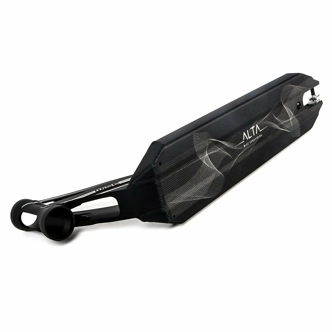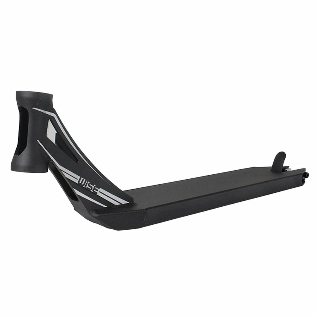 The Wise Alta Deck is 4.9″ wide by 22″ long, with an 83.5 degree headtube angle. Headtube angle affects a couple of things. The steep rake of the Wise Deck makes it perfect for those riders who have mastered the single tail whip and are moving onto multiple whips. The steeper the headtube angle, the more the Alta Deck whips around a flat plane with less resistance. Because the deck does not have boxed ends, we consider the Wise Scooter Deck to be a park deck but it’s equally at home at the skatepark or in your hood. PRO SCOOTER DECKS that are 22-22.99″ long will be ideal for intermediate to pro riders that have been in the sport for a while or for those scooter riders that need a little more footspace. The Wise Alta Scooter Deck works with the following wheel diameters: 100mm,110mm,115mm,120mm,125mm and the following wheel widths: 24mm,26mm. Note that decks typically come standard with 24mm spacers. If you change the wheel core width, you will also need to change your spacers to accomodate the new wheel core width.